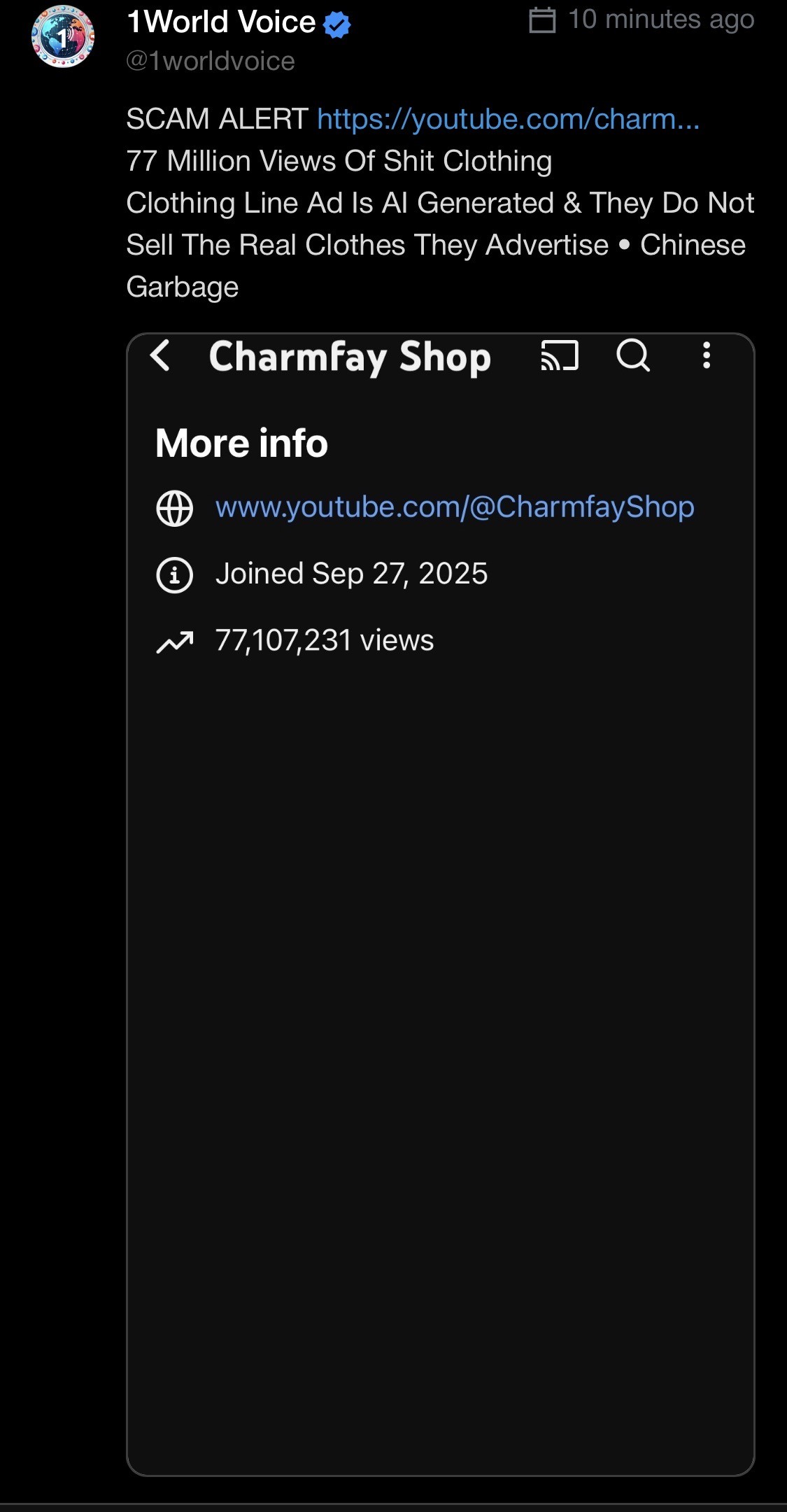 #ScamAlert CharmfayShop on YouTube has over 77 Million Views & Selling On YouTube Channel Using AI Generated Clothing Ad. • Clothes Are Garbage Polyester Screen Printed